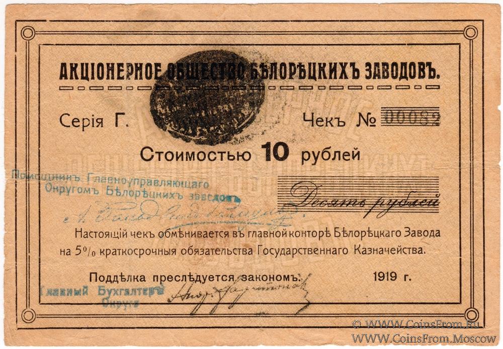 Чек 1919 г. Выпуск 1. Большой формат. Серия Г. Законченный. Акционерное Общество Белорецких Заводов.