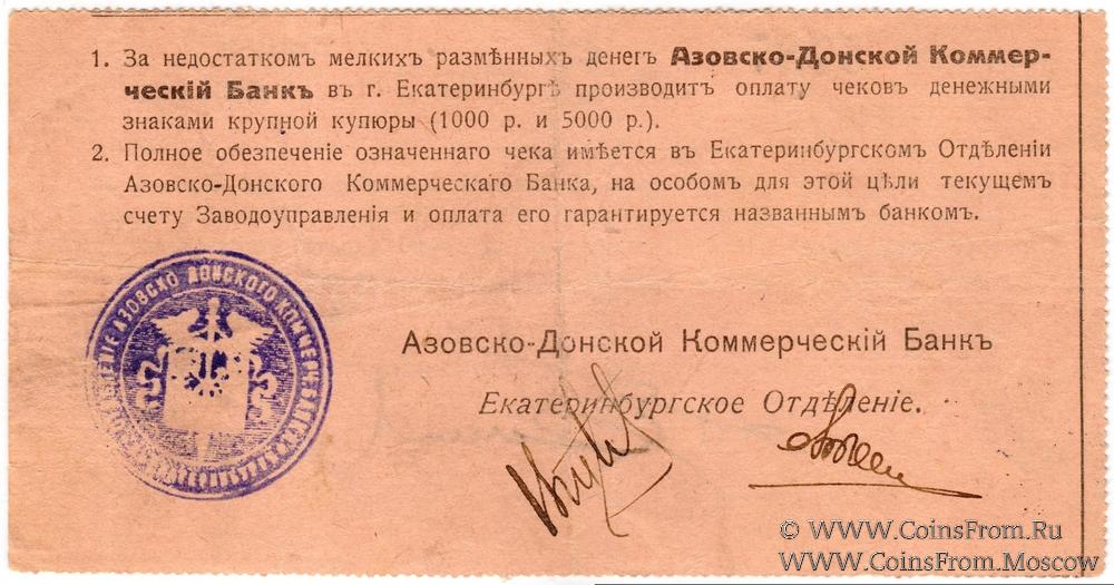 Чек. Серия ДI. Выдан 1 июня 1919. Крестообразное гашение. Азовско-Донской Коммерческий Банк (за счет Главного Управления Верх-Исетских заводов).