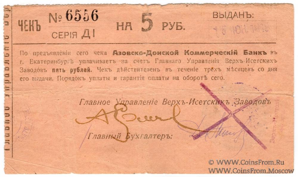 Чек. Серия ДI. Выдан 16 июня 1919 г. Крестообразное гашение. Азовско-Донской Коммерческий Банк (за счет Главного Управления Верх-Исетских заводов).