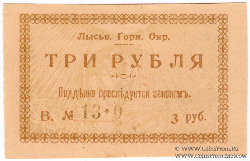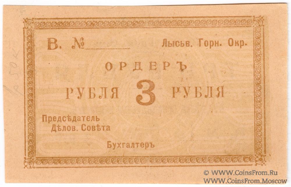 Ордер без даты 1918 г. БРАК нумератора смещение цифры), номер только на реверсе. Серия В. Бланк. Бумага желтая. Лысьвенский Горный Округ.