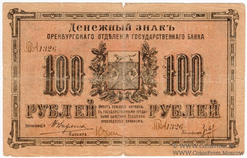 Денежный знак 1917 г. Серии 700-1400. Кассир: Юрин Г.В. С разрешения местной власти (атаман Дутов А.И.).