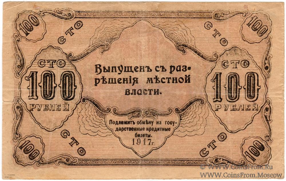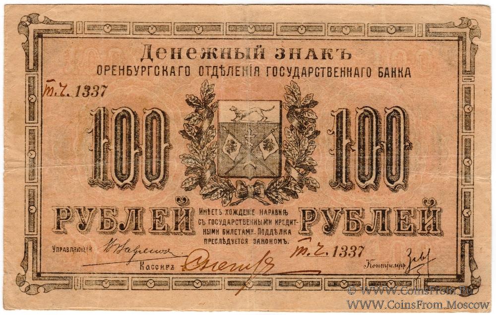 Денежный знак 1917 г. Серии 700-1400. Кассир: Снегирева С.И. С разрешения местной власти (атаман Дутов А.И.).