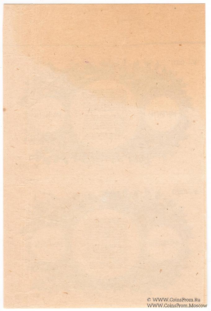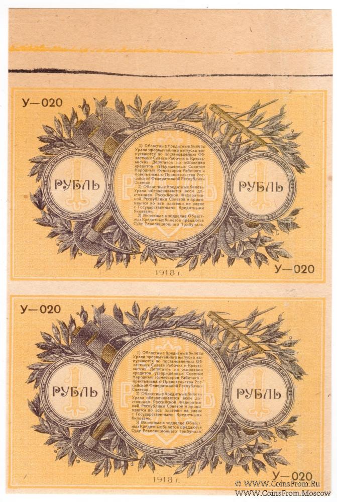 Областной кредитный билет Урала 1918 г. БРАК: сцепка вертикальная из двух реверсов (недопечатка), необрезана (верх листа). Екатеринбургское Отделение Государственного Банка.