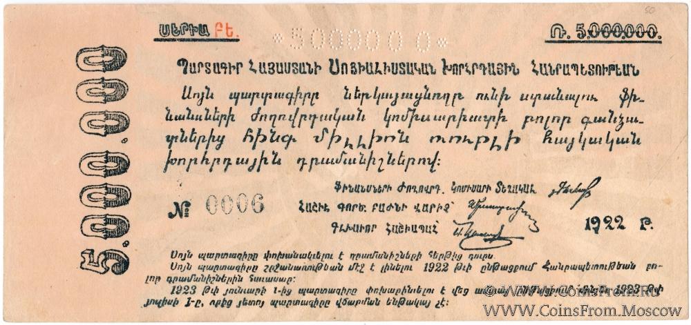 Обязательство 1922 г. № 0006. Без водяного знака. Перфорация "уже". Народный Комиссариат Финансов Социалистической Советской Республики Армении.
