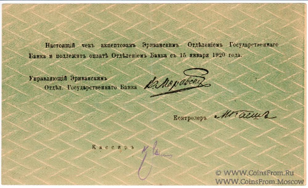 Большой формы. Серия Д. Фон реверса: "плетенка". Зелёный фон. Чек. Август 1919 г. Срок 15.01.1920 г. Эриванское Отделение Государственного Банка.