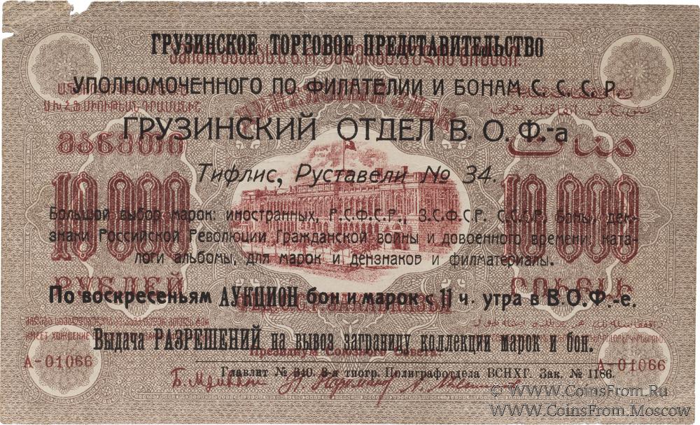 Надпечатка: "Грузинское торговое представительство уполномоченного по филателии и бонам С.С.С.Р. Грузинский отдел В.О.Ф.-а. Тифлис, Руставели № 34. Большой выбор марок: иностранных, РСФСР, ЗСФСР, СССР, Боны, дензнаки Российской Революции Гражданской войны и довоенного времени: каталоги альбомы для марок и дензнаков и филматериалы. По воскресеньям аукцион бон и марок с 11 ч. утра в В.О.Ф.-е. Выдача разрешений на вывоз заграницу коллекции марок и бон.".