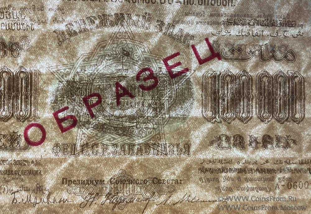 Денежный знак 1923 г. 1-й выпуск. ОБРАЗЕЦ (двусторонний): диагональная надпечатка красного цвета "ОБРАЗЕЦ" на аверсе (на реверсе зеркально). Завитки рамки на реверсе в одну сторону. Водяной знак - "большие теневые звёзды".