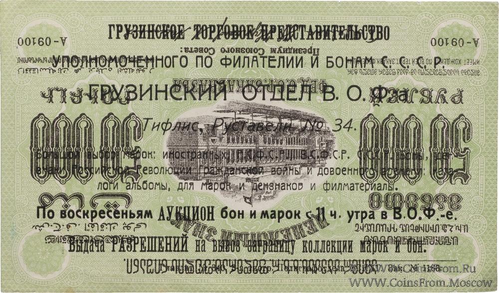 Надпечатка: "Грузинское торговое представительство уполномоченного по филателии и бонам С.С.С.Р. Грузинский отдел В.О.Ф.-а. Тифлис, Руставели № 34. Большой выбор марок: иностранных, РСФСР, ЗСФСР, СССР, Боны, дензнаки Российской Революции Гражданской войны и довоенного времени: каталоги альбомы для марок и дензнаков и филматериалы. По воскресеньям аукцион бон и марок с 11 ч. утра в В.О.Ф.-е. Выдача разрешений на вывоз заграницу коллекции марок и бон.".