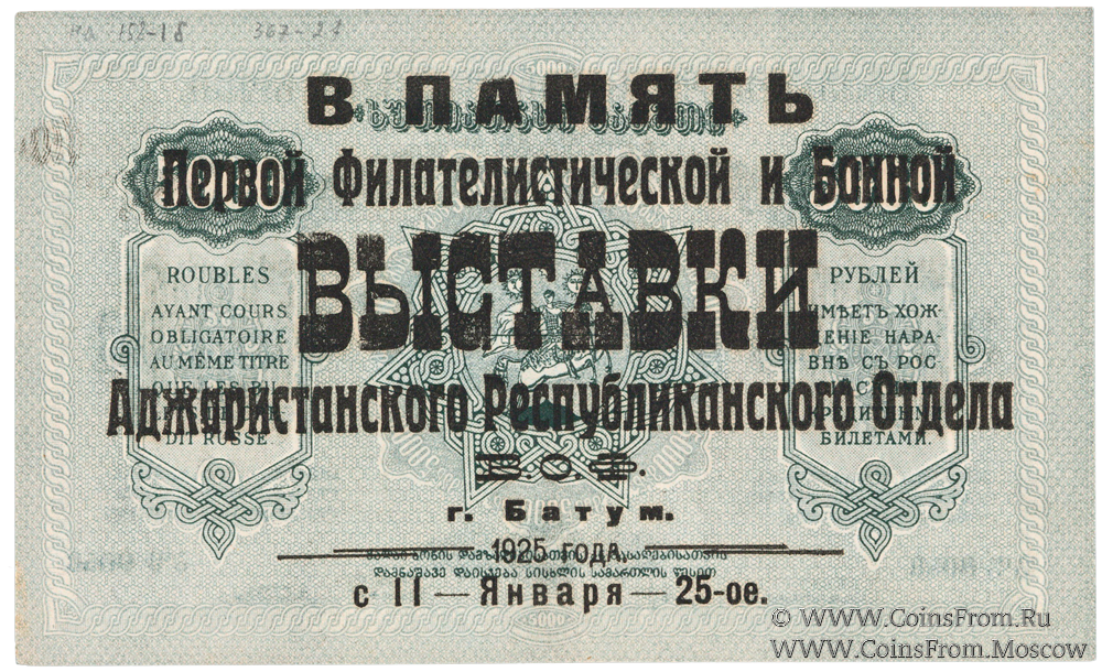Надпечатка: "В память Первой Филателистической и Бонной выставки Аджаристанского Республиканского отдела В.О.Ф. г. Батум. 1925 года. С 11-Января-25-ое.".