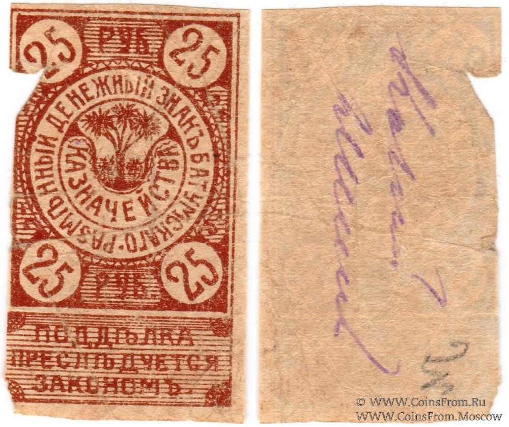Разменный денежный знак без даты (1919 г.). Коричневый. С подписями на реверсе. Батумское Казначейство.