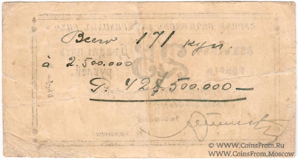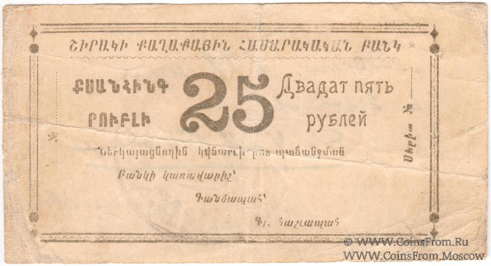 БРАК: опечатка в тексте "Двадат пять". Цифры номинала широкие. Рамка 1 типа. Законченный. Александропольский Городской Общественный Банк.