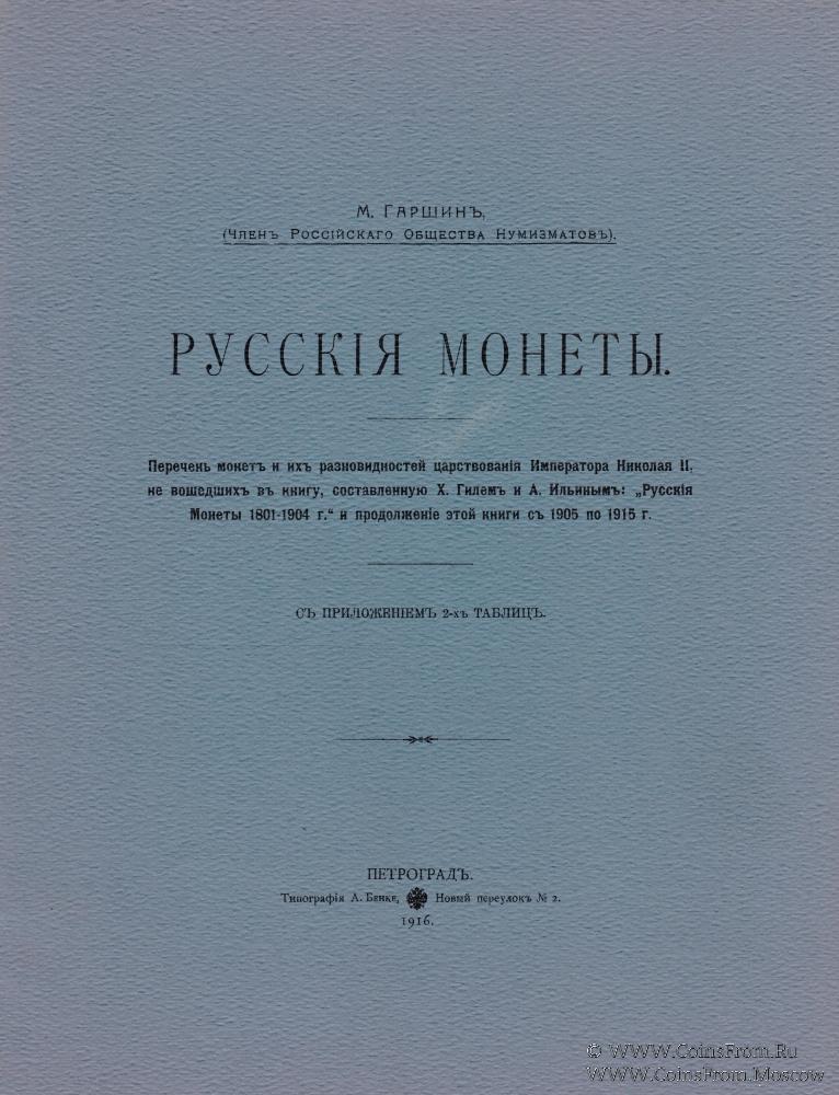 В книге дан перечень монет и их разновидностей царствования Императора Николая II не вошедших в книгу, составленную Х.Гилем и А. Ильиным с приложением 2 таблиц.