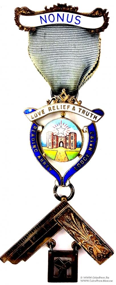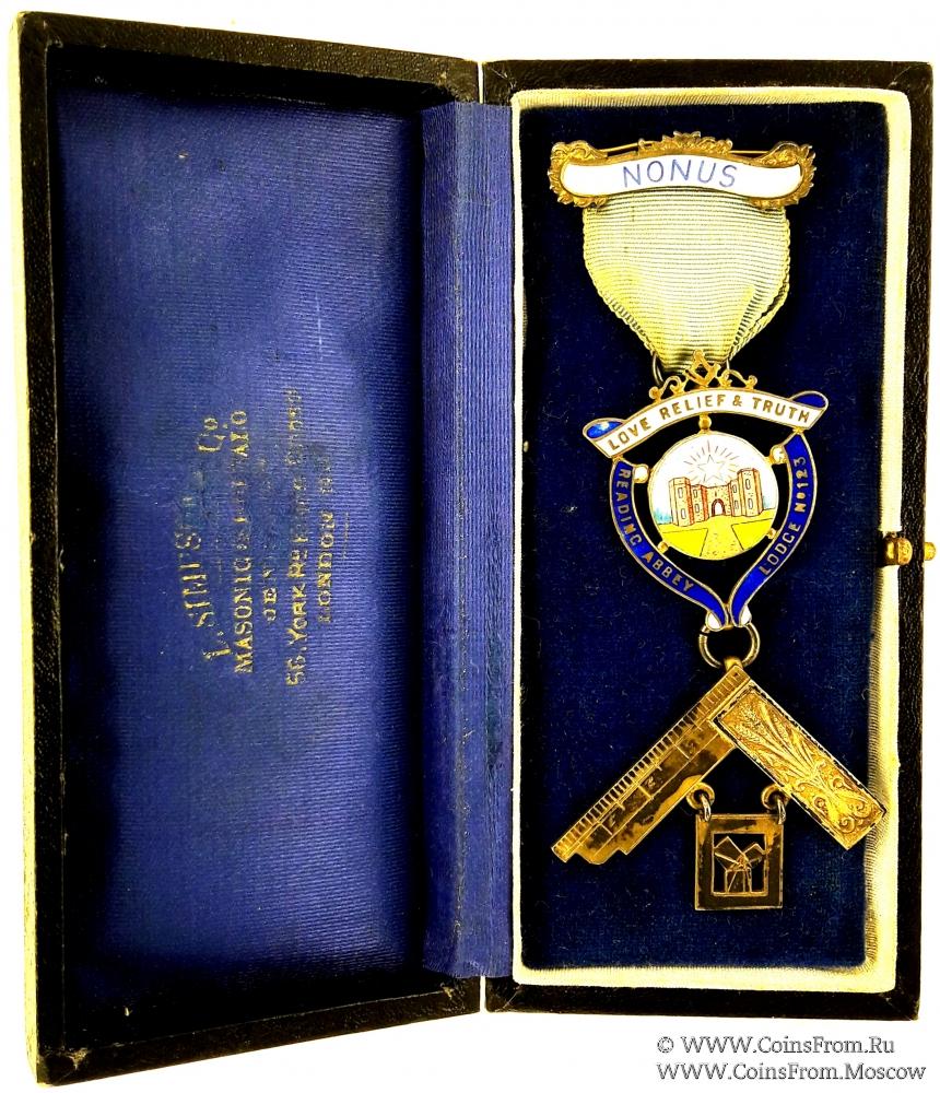 Знак Прошлому Досточтимому Мастеру. Знак двойной. Верхняя часть знака в центре имеет круг с картиной по эмали. Круг обрамлён лентами. На верхней ленте по белой эиали девиз: LOVE RELIEF & TRUTH - любовь, облегчение и правда. Сверху ленты циркуль и наугольник прикрывающие место крепления знака к ленте. На боковых лентах синей эмали название и номер Ложи. К нижней части синих лент с помощью кольца крепится подвеска Прошлого Мастера в виде наугольника и с малой подвеской квадратной формы, отображающей символическое изображение чертежа к 47 теореме из первой книги Евклида (теорема Пифагора).