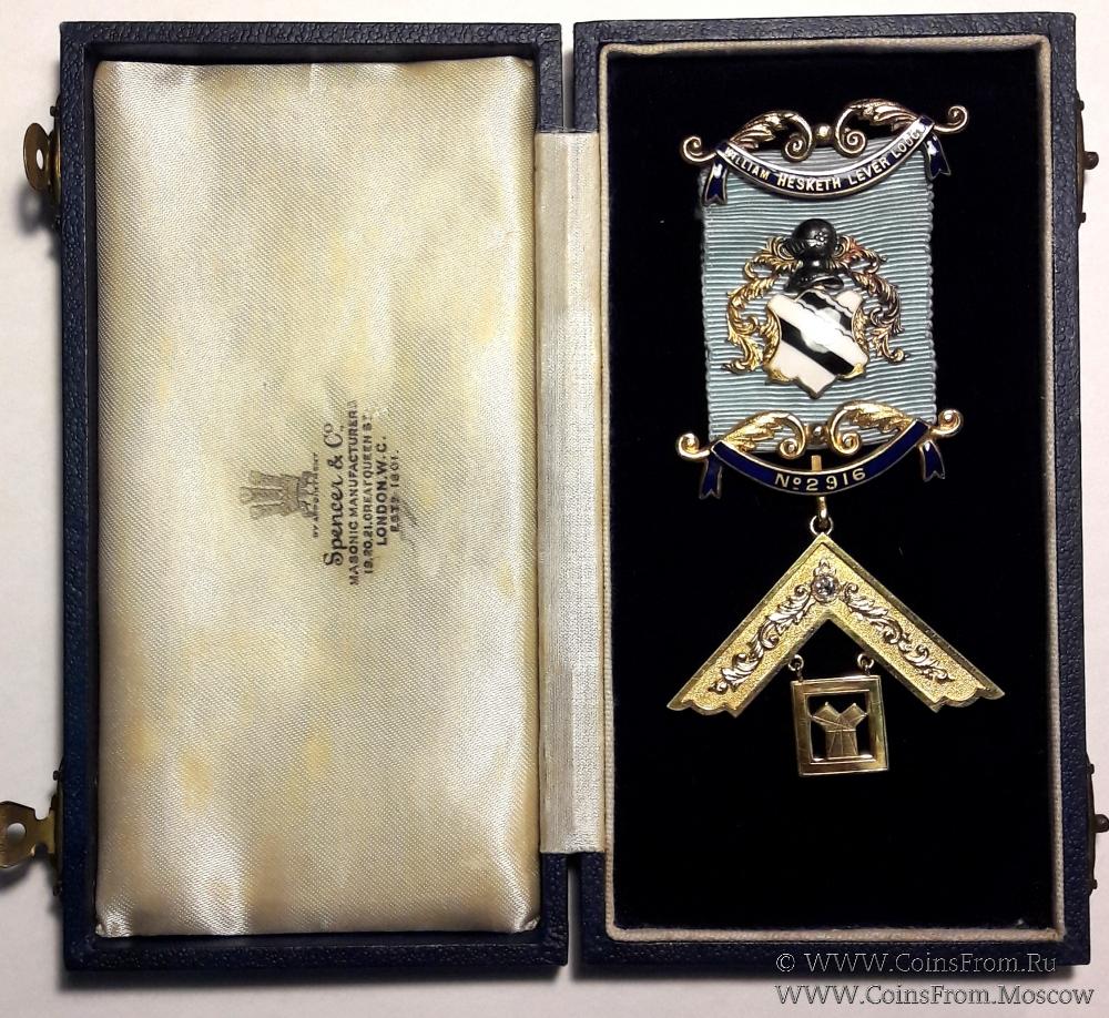 Гравировка на реверсе знака: PRESENTED TO W. BRO. WILLIAM JOHN DAVIES BY THE OFFICERS AND BRE THREN OF THE WILLIAM HESKETCH LEVER LODGE № 2916 ON THE OCCASION OF HIS RETIREMENT FROM THE CHAIR 23RD OKTOBER 1980. – Представлен уважаемый Брат УИЛЬЯМ ДЖОН ДЕЙВИС сотрудниками и братьями Ложи WILLIAM HESKETCH LEVER LODGE № 2916 по случаю его отставки 23 октября 1980 г.