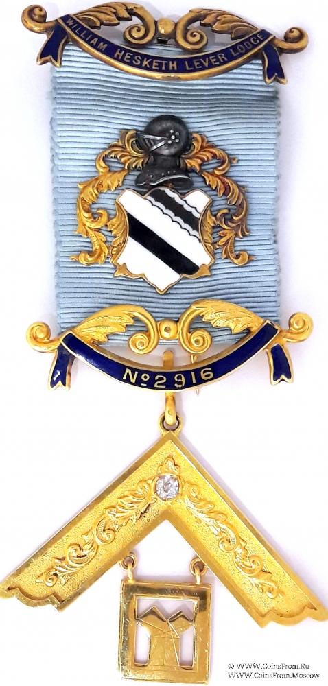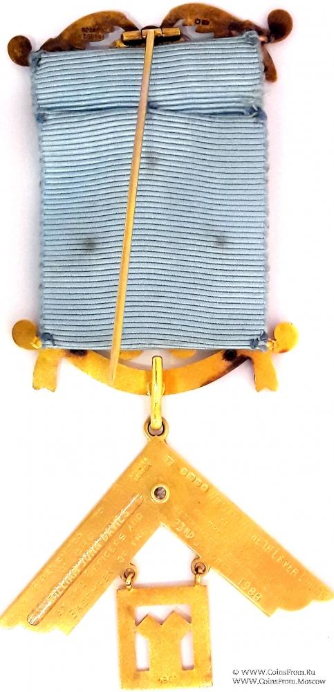 Лента небесно-голубого цвета. Верхняя колодка в виде ленты синей эмали, перекинутой через символические ветви с наименованием Ложи WILLIAM HESKETCH LEVER LODGE.