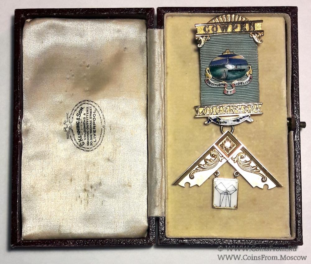 Гравировка на реверсе знака: W.M. 1953. PRESENTED TO W. BRO. JAMES HEATLEY WORSHIPFUL MASTER OF COWPEN LODGE № 4824 A TRIBUTE OF MERIT REGARD & ESTEEM – Досточтимый Мастер 1953. Представлен уважаемый брат ДЖЕЙМС ХИТЛИ Досточтимый Мастер Ложи COWPEN № 4824 за заслуги в знак уважения.