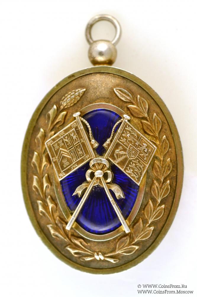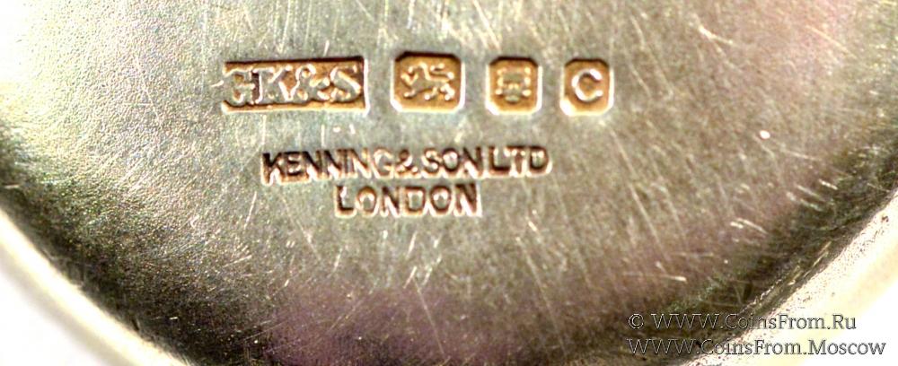 Знак овальной формы жёлтого цвета в центре на синем лучистом фоне два перекрещенных знамени перевитых лентой. На Левом Герб Великой Ложи Англии, на правом щит с герба Королевы Англии. У офицеров Великой Ложи знак овальной формы с должностной эмблемой на синем фоне и по кругу венок с одной стороны из колоса, с другой – из оливковой ветви.