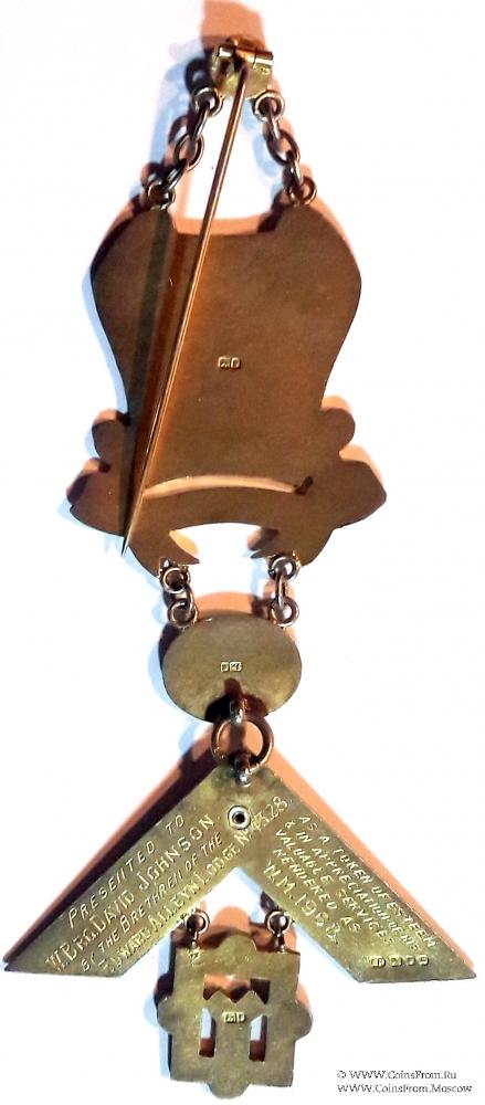 РЕВЕРС: гравировка: PRESENTED TO W.BRO. DAVID JOHNSON BY THE BRETHREN OF THE EDWARD ALLEYN LODGE № 4328 AS A TOKEN OF ESTEEM& IN APPRECIATION OF HIS VALUABLE SERVICES AS W. M. 1968 – Вручён Уважаемому Брату DAVID JOHNSON братьями Ложи № 4328 EDWARD ALLEYN LODGE в знак уважения и в знак признательности за его ценные услуги как Досточтимого Мастера 1968 г. Все элементы знака имеют клеймо: лев и голова леопарда. Клейма на наугольнике: ЕР, лев, голова леопарда, m. На кольце – лев. Выпуск Лондон. Год выпуска 1967.