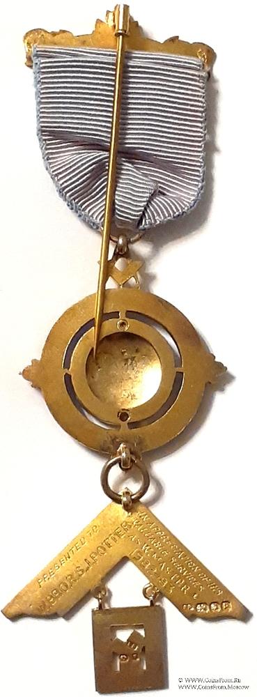 РЕВЕРС: гравировка: Presented to W. Bro. R.S.J. Potter in Appreciation of his Valuable Services as W. Master 1982-83. Клейма: на наугольнике – Е.Р., лев, голова леопарда, Р (1950), на подвеске - Е.Р., лев, голова леопарда. На кольце – лев.