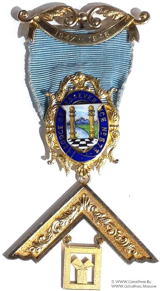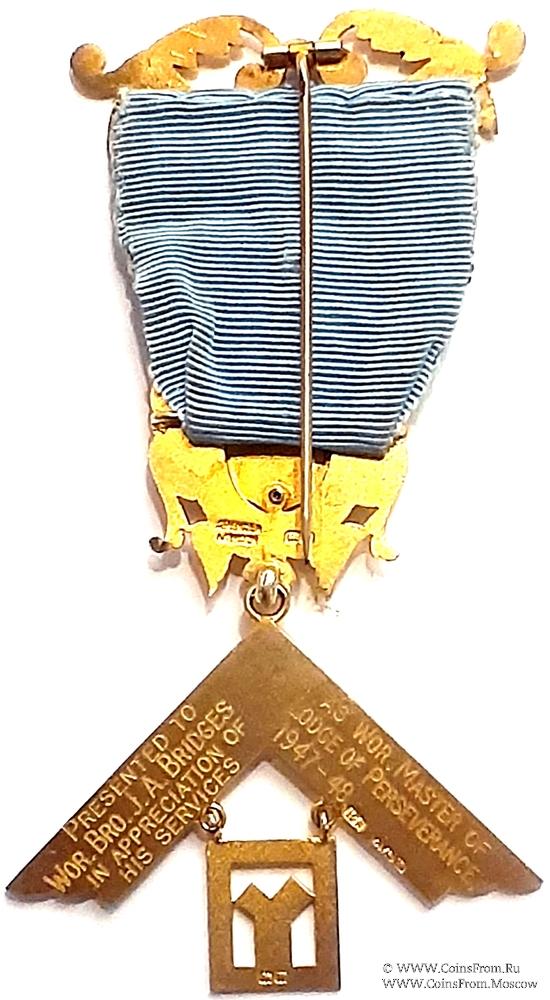 РЕВЕРС: гравировка: Presented to Wor. Bro. J.A. Bridges In Appreciation of his Services as Wor. Master of Lodge of Perseverance 1947-48 - Представлен Уважаемый Брат J. A. Bridges в знак признательности за его заслуги в качестве Досточтимого Мастер ложи 1947-48. Клейма: на подвеске – лев, W, на наугольнике – R.S. якорь, лев, W(1946), верхняя часть – Spencer, London, лев, W. Верхняя колодка - Spencer, London.