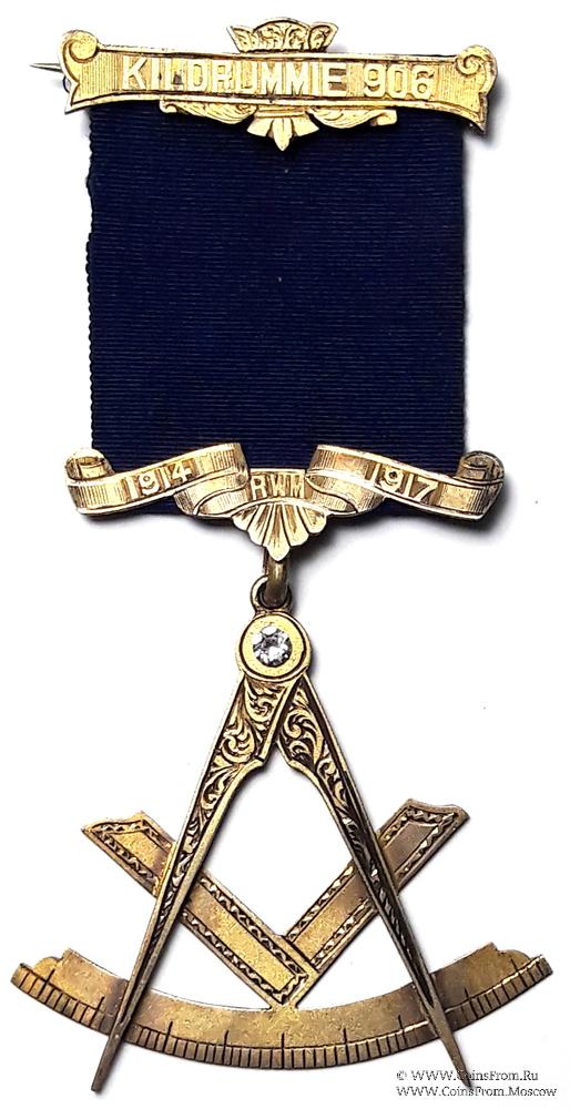 КОЛОДКИ/МЕДАЛЬОН: верхняя колодка в виде ленты с короной и трилистником снизу с наименованием и номером Ложи и булавкой для носки. Нижняя колодка в форме ленты с датой 1914-1917 и надписью R.W.M. (Right Worshipful Master -истинно Досточтимый Мастер).