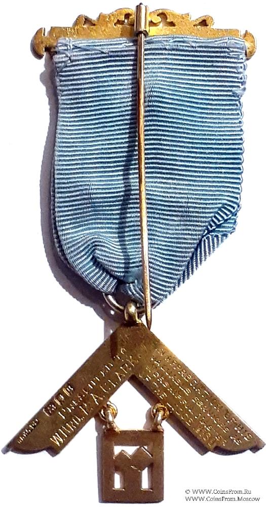 РЕВЕРС: гравировка: Presented to W. Bro. P.A. Clark In Appreciation of his Valuable Services as Wor-shipful Master of the Lodge 1958-9. Представлен Уважаемый Брат P.A. Clark в знак признательности за его ценные заслуги в качестве Досточтимого Мастера 1958-9. Клейма: на наугольнике WTL&Co, Лев, голова леопарда, u (1935).