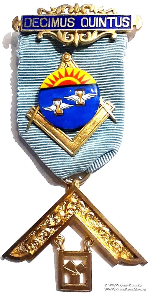 КОЛОДКИ/МЕДАЛЬОН: верхняя колодка прямоугольная, украшенная снизу и сверху орнаментом. Надпись – Decimus Quintus. На ленте медальон в форме циркуля с наугольником и накладного круга с рисунком на эмали. На синем фоне двое песочных часов с крыльями и восходящее солнце на жёлтом фоне.