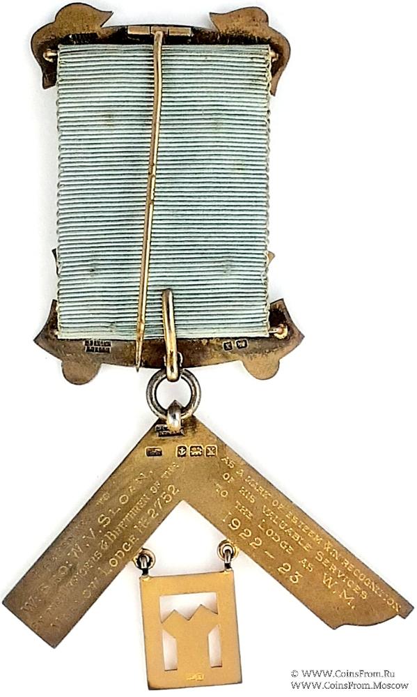 РЕВЕРС: гравировка: Presented to W: Bro. W.V. Sloan by the Officers & Brethren of the Marlow Lodge № 2752 as a Mark of Esteem & in Recognition of his Valuable Services to the Lodge as W. M. 1922-23 - Представлен Уважаемый Брат W.V. Sloan офицерами и братьями ложи Marlow № 2752 в знак уважения и признания его ценных заслуг перед ложей в качестве Досточтимого Мастера 1922-23 гг. Клейма: на наугольнике – Spencer London. RS, якорь, лев, Х (1922). На подвеске - лев, Х.