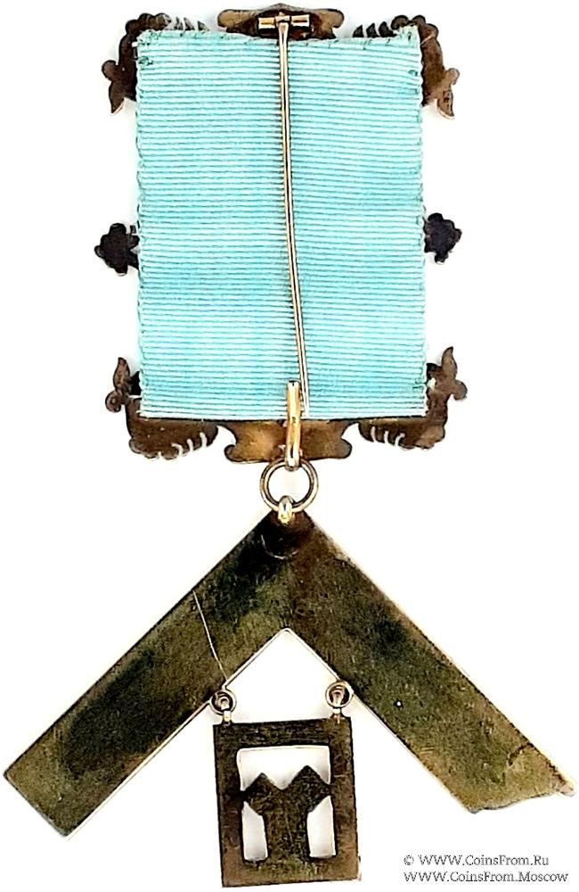 КОЛОДКИ/МЕДАЛЬОН: верхняя и нижняя колодки идентичны по форме, в виде металлического орнамента с резьбой по металлу. На верхней колодке накладными металлическими буквами написано наименование Ложи (Ardwick Lodge). В центре ленты медальон в виде резного орнамента с номером Ложи (2185), написанным накладными металлическими цифрами.