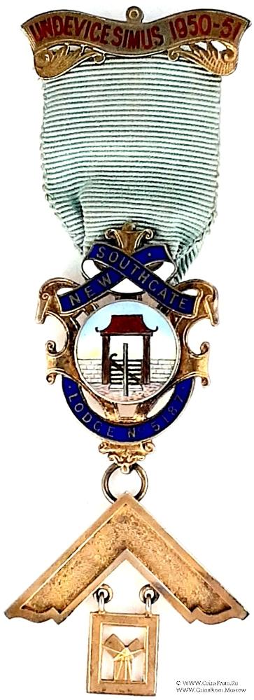 РЕВЕРС: гравировка: Presented to W: Bro. H.F.C. China by the Members of the New Southgate Lodge № 5187. 1950-51 - Представлен Уважаемый Брат H.F.C. China членами ложи New Southgate № 5187 1950-51 гг. Клейма: на наугольнике - GK&S, лев, голова леопарда, О (1949), на подвеске - лев, голова леопарда, на верхней части и верхней колодке - GK&S, лев, голова леопарда.