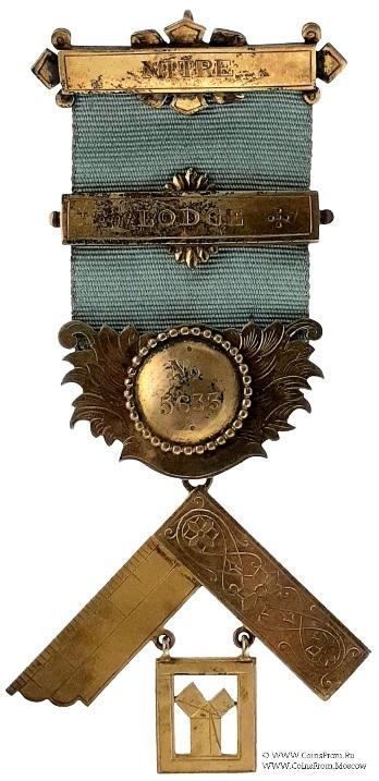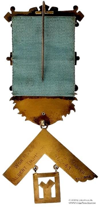 РЕВЕРС: клейма: наугольник – TK&S, якорь, лев, М (1961), подвеска – лев. Гравировка: Wor. Bro. Albert Thompson Worshipful Master 1962-63.