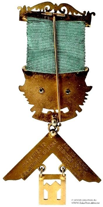РЕВЕРС: клейма: наугольник – Silver. Гравировка: Presented to W. Bro. Thomas Gilmore for his Valued Services as W.M. 1970-1.