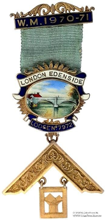КОЛОДКИ/МЕДАЛЬОН: верхняя колодка в виде прямоугольника синей эмали с аббревиатурой должности и датой W.M. 1970-71. Верх колодки украшен орнаментом.