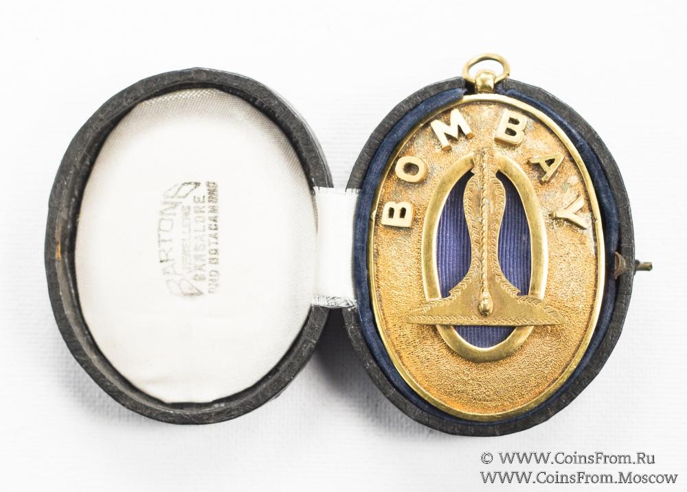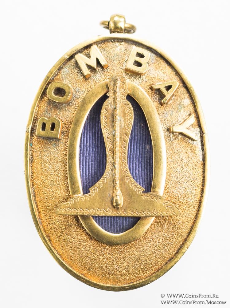 Знак овальной формы жёлтого цвета в центре на синем фоне ватерпас, символ первого стража Ложи. В верху название региона BOMBAY.