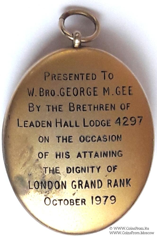 РЕВЕРС: гравировка: Presented To W.Bro. George M. GEE By the Brethren of Leaden Hall Lodge 4297 on the occasion of his attaining the Dignity of LONDON GRAND RANK October 1979 – Вручён Уважаемому Брату George M. Братьями  Ложи of Leaden Hall Lodge 4297 по случаю присвоения LONDON GRAND RANK, октябрь 1979 года. Год выпуска: 1979.