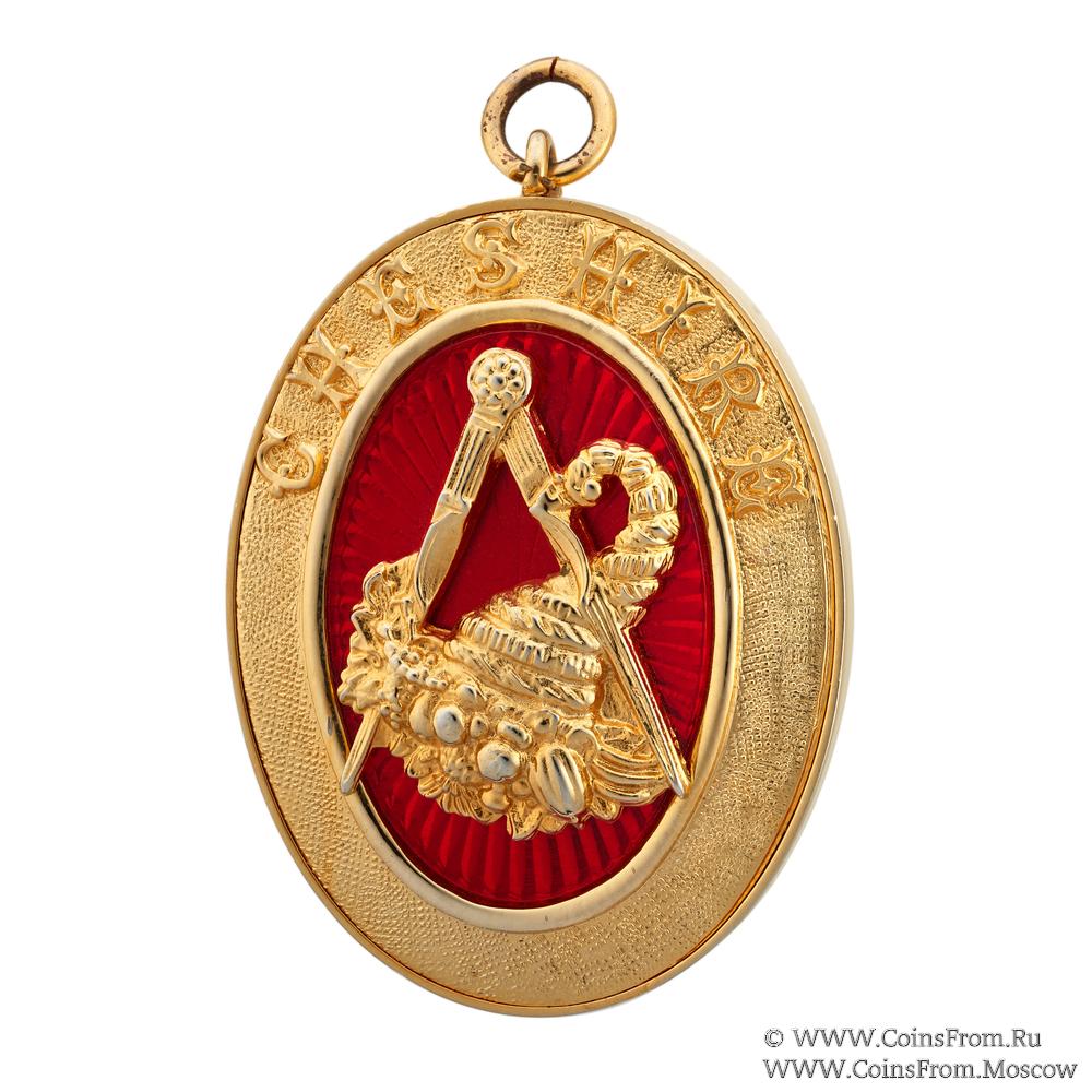АВЕРС: овальной формы жёлтого цвета в центре на красном фоне циркуль и «рог изобилия» - символ должности Стюарда. В верхней части знака по кругу наименование провинции CHESHIRE.