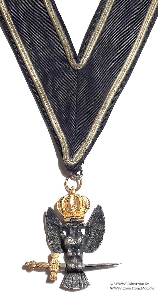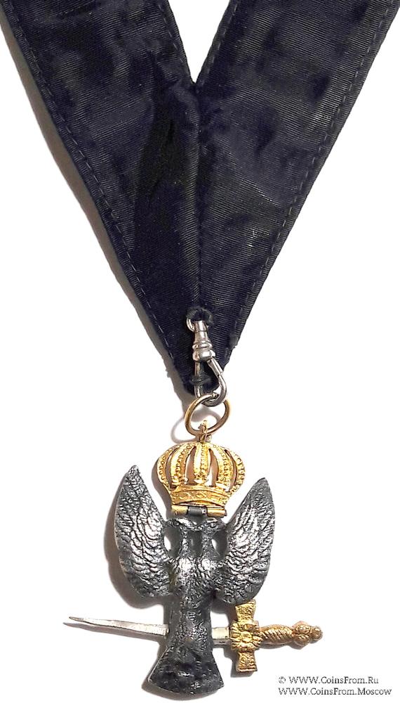 Знак Великого Избранного Рыцаря Кадош или Рыцаря Чёрного Орла. Подвеска в виде двуглавого орла чёрного цвета с мечом в лапах увенчанного золотой короной (Эмблема ДПШУ). Носится на чёрной ленте с белым кантом по краю.