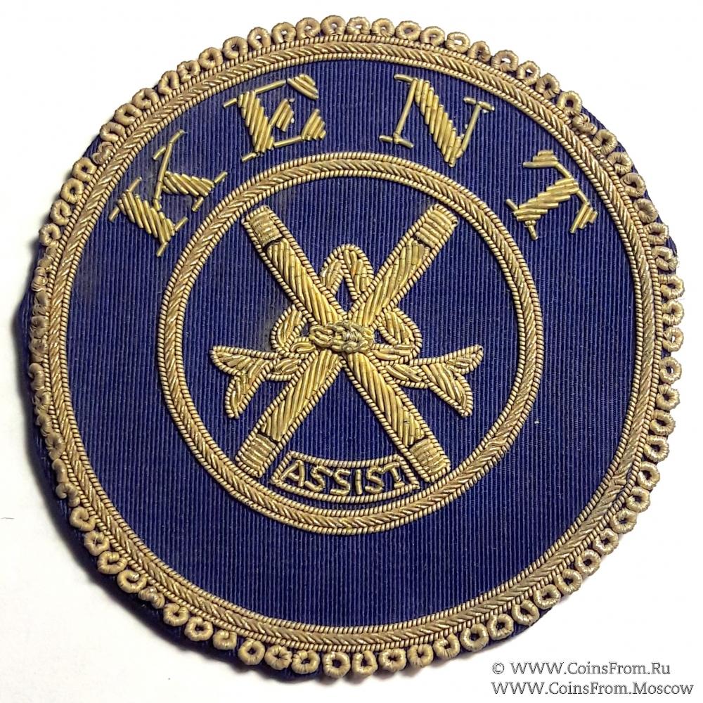Нашивки провинции Кент помощника (ASSIST, ASSISTANT) Великого Провинциального Церемониймейстера (символ должности два жезла связанные лентой). На белом фоне золотошвейная вышивка на парадный запон Великого Провинциального Церемониймейстера, на синем фоне и шитьё синим шёлком с золотой оторочкой для повседневного запона Великого Провинциального Церемониймейстера.