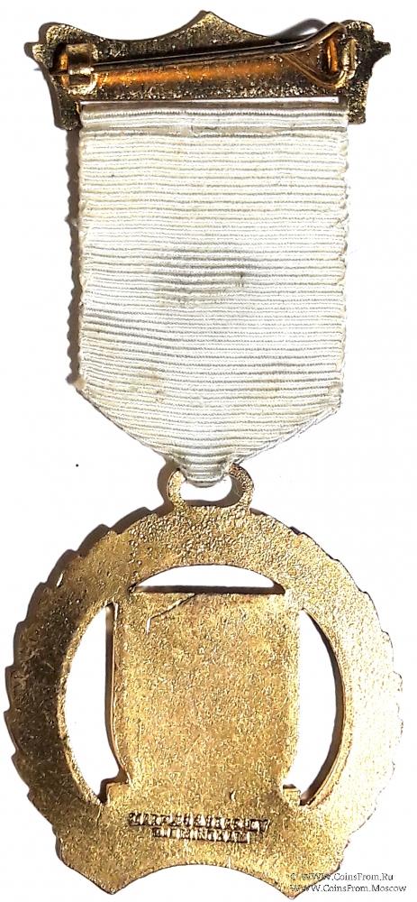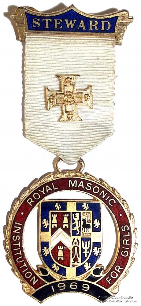 Знак в виде усечённого снизу круга красной эмали обрамлённого венком. По кругу название института и дата по усечённому участку 1969. Внутри малый круга герб Великой Ложи Англии. Дваойная рамка вокруг малого герба разделена крестом, между лучами которого изображено по 2 лвосстающих льва.
