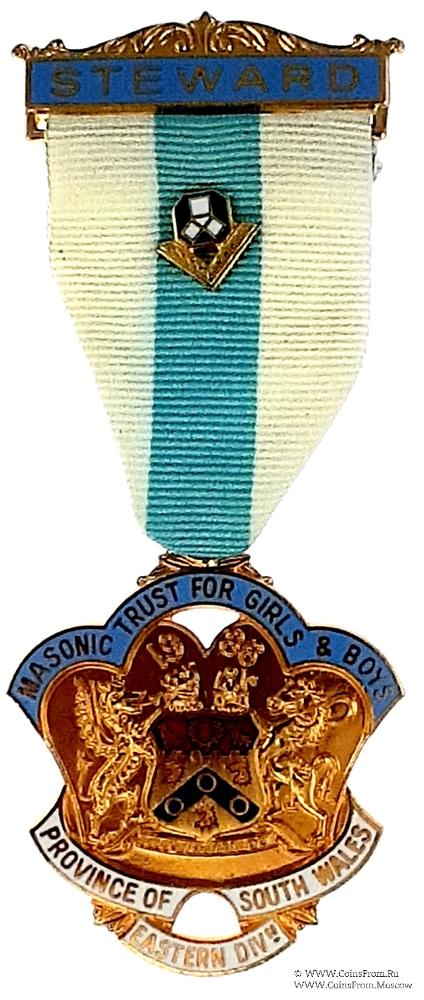 АВЕРС: снизу и сверху ограничен лентами. Верхняя лента голубой эмали с названием благотворительного фонда Masonic Trust for Girls & Boys. Нижняя лента белой эмали с названием провинции Южный Уэльс. Внутри лент размещён большой герб. Правый щитодержатель – дракон, левый – конь. Подножием для щитодержателей является лента с девизом на латыни Vive Anima Dei. Щит с красной главой, на которой изображены: в центре – венок, с боков птицы. Нижняя часть щита разделена стропилом синей эмали с тремя кругами. Справа, слева и в основании щита головы львов. На щите через бурлет размещены два клейнода, выше которых дата 1986.