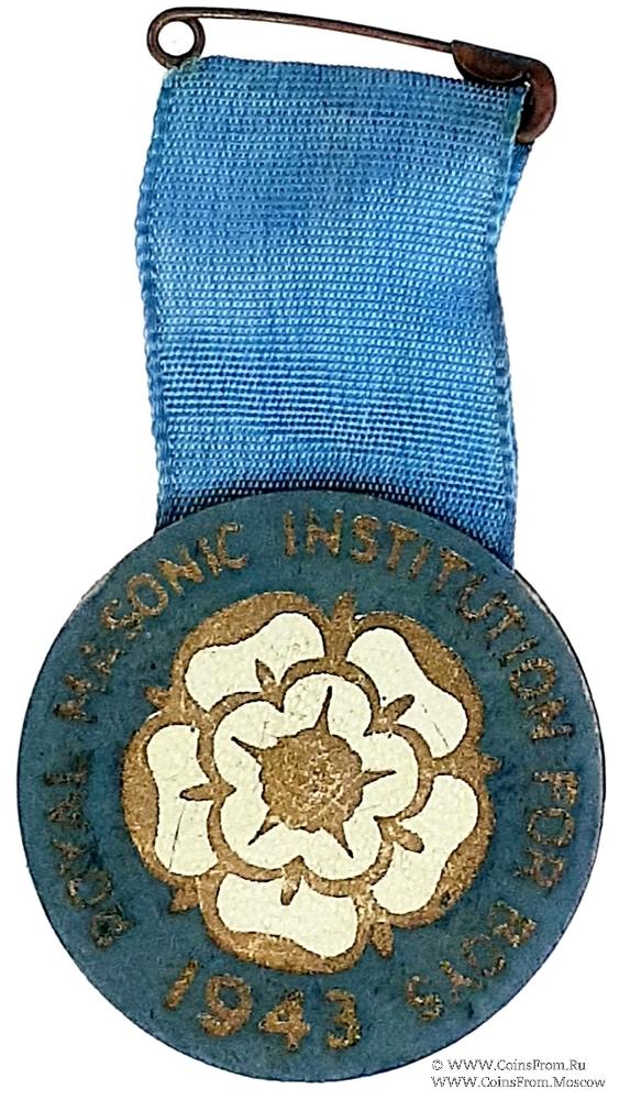 АВЕРС: круглой формы. В центре белая роза Йорков. По кругу наименование благотворительного заведения и дата 1943.