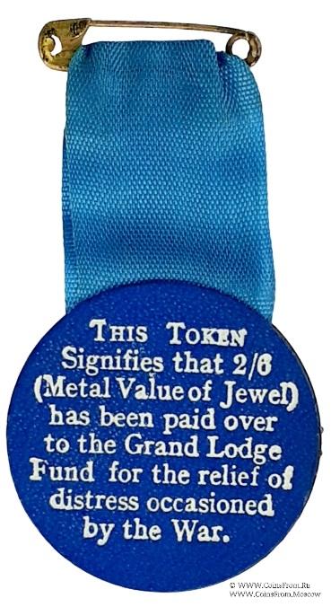 РЕВЕРС: синего цвета с надписью: This Token Signifies that 2/6 (Metal Value of Jewel) has been paid over to the Grand Lodge Fund for the relief of distress occasioned by the War. (Этот Знак означает, что 2/6 (Металлическая стоимость Драгоценного камня) было выплачено в Фонд Великой Ложи для облегчения страданий, вызванных Войной).