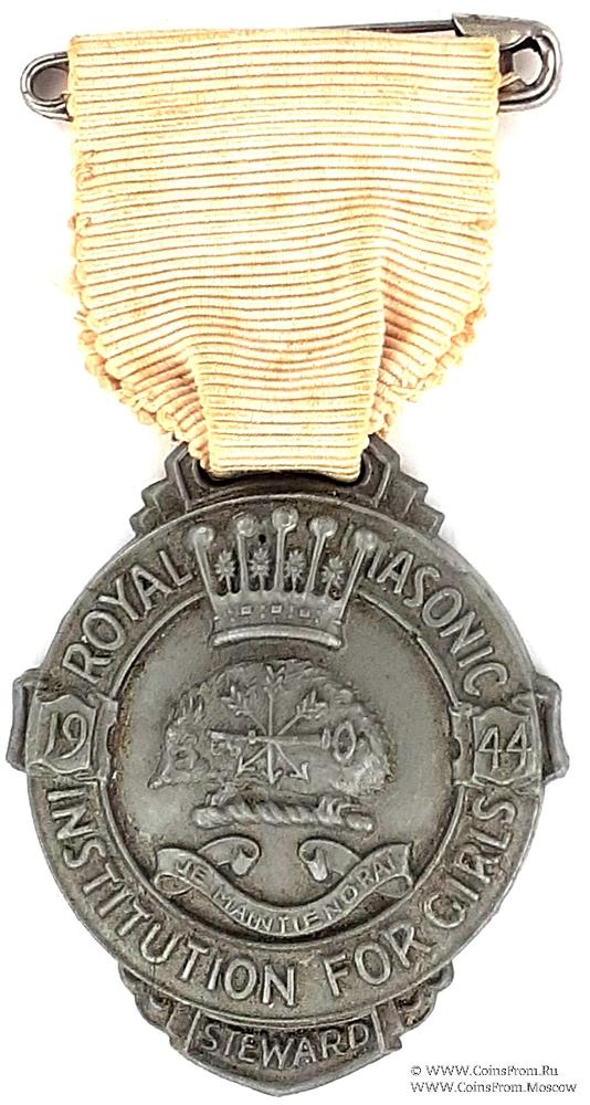 АВЕРС: двойной круг с наименованием благотворительного заведения (The Royal Masonic Institution for Girls). Ниже круга на дополнительной пластине надпись Steward. Слева и справа на лентах дата 1944. В центре изображение венценосного ежа на бурелете с символикой на теле в виде символического ключа и трёх перекрещенных стрел остриём вниз. Ниже ежа на девизной ленте надпись: Je maintiendrai.