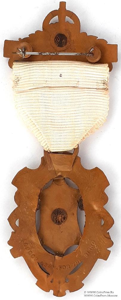 АВЕРС: в форме щита с полым центром. Сверху накладной шестиугольный щит с символикой. С боков и снизу полый щит обвит лентой с наименованием благотворительного заведения (The Royal Masonic Institution for Girls). В нижней части дата 1945.