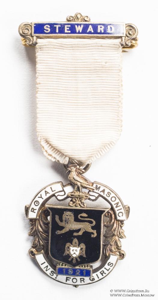 Цвет ленты белый. Колодка с орнаментами по бокам и трилистником сверху синей эмали с надписью STEWARD и булавкой для ношения с обратной стороны. В низу лента непосредственно, без металлической колодки, соединена с кольцом знака.