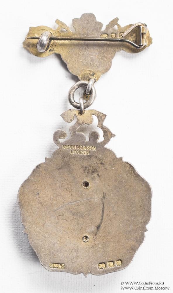 Вверху знака вязь из двух букв EL (England Lancashire). с кольцом для крепления. Верхняя колодка металлическая в виде ленты голубого цвета на фоне букета из двух бутонов и 1 розы. По краям розетки жёлтого цвета.Все элементы знака, включая кольцо выполнены из серебра с позолотой и эмалью, что подтверждается соответствующими клеймами.