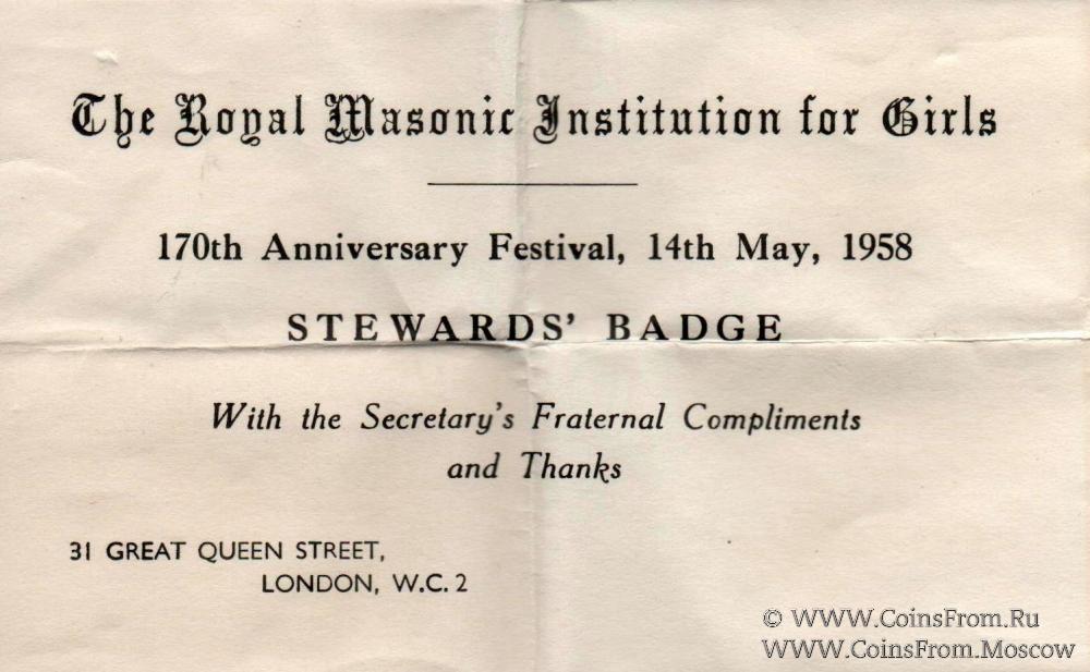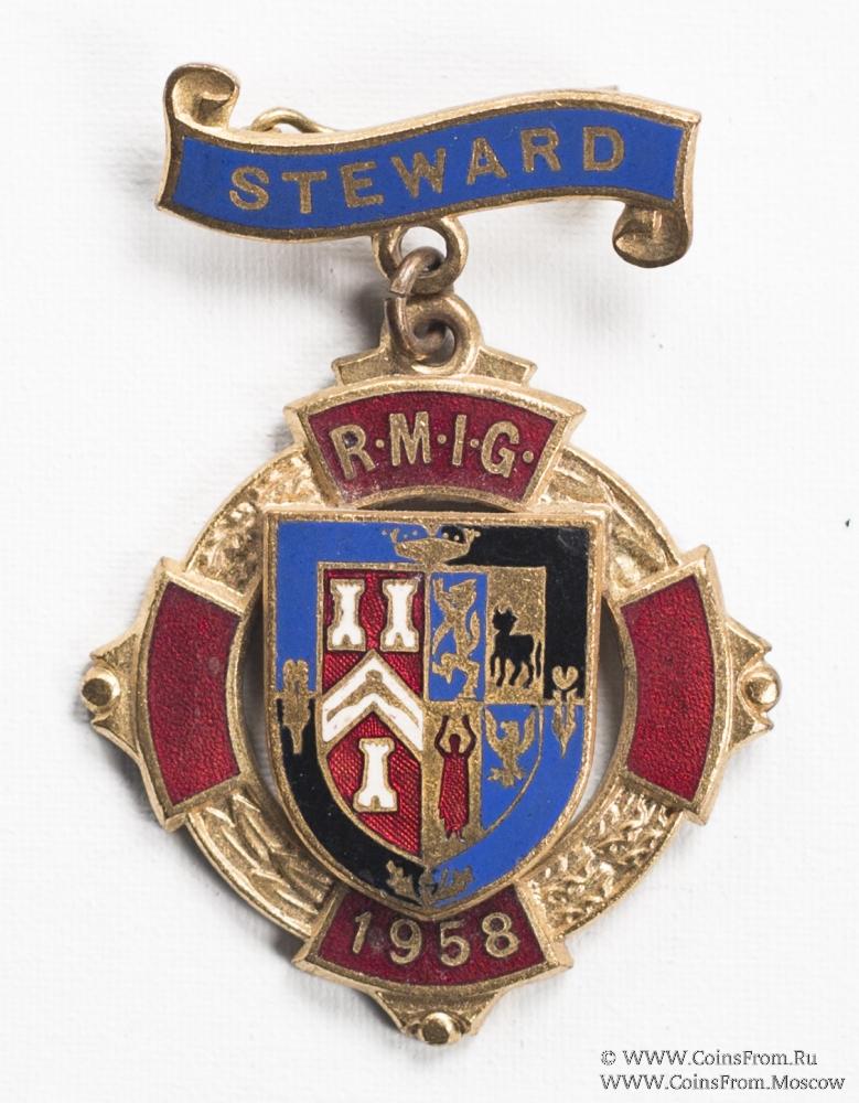 Основу знака составляет круглый венок из листьев дуба и акации, на котором с четырёх сторон размещены лучи от креста красной эмали. На верхнем луче знака надпись RMIG, на нижнем дата 1958. В центре креста малый герб Великой Ложи Англии в виде щита. В двойной сине-чёрной рамке малого герба размещены рисунки: сверху - корона, снизу - листья дуба, по бокам - по цветку на стебле.