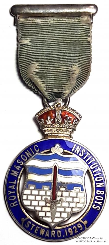 Знак круглой формы. В круге синей эмали наименование института ROYAL MASONIC INSTITUTION BOYS. – Королевский Масонский институт для мальчиков, надпись STEWARD и дата проведения благотворительного мероприятия 1929. В центре знака малый герб в виде щита. Верх знака увенчан короной красной эмали.
