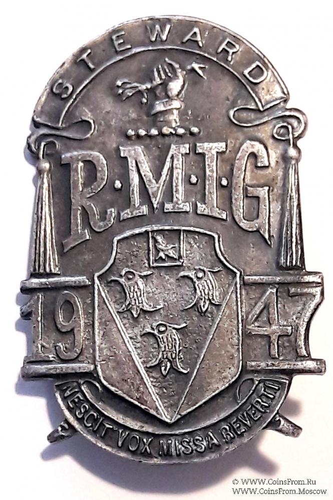 Знак овальной формы. Сверху и снизу знак ограничен лентами с надписями. Верхняя дугообразная лента с надписью STEWARD с боков заканчивается кистями. На нижней дугообразной ленте надпись на латыни NESCIT VOX MISSA REVERTI. В нижней части овала размещён герб в виде щита с опрокинутым остриём, в котором изображены три головы орла и птица в малом квадрате в верхней части щита. С боков от щита дата 1947. Навершием у щита надпись RMIG на которой на бурлете размещён клейнод в виде руки, сжимающей лапу орла. С обратной стороны знака вертикальная булавка для носки.