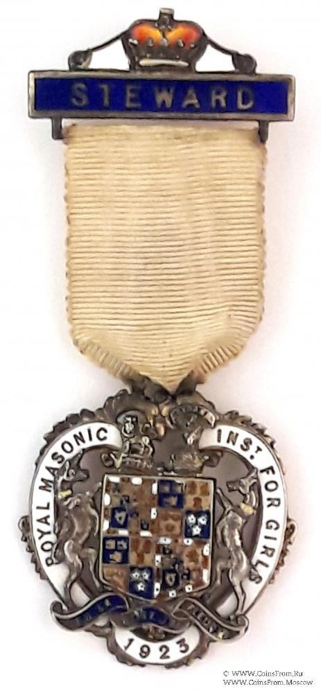 Лента знака белая. Верхняя колодка в форме пластины синей эмали с надписью STEWARD и красной короной сверху.